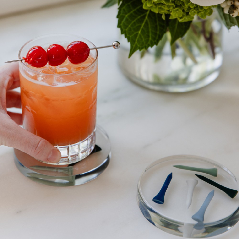 Our Golf Tee Coasters are made from chunky acrylic and encapsulate real golf tees within the coaster to make a lovely, contemporary gift for any golfer.