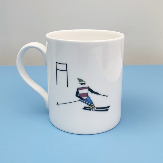Made and printed in England the bone china mug features a slalom skier repeated on both sides of the mug.