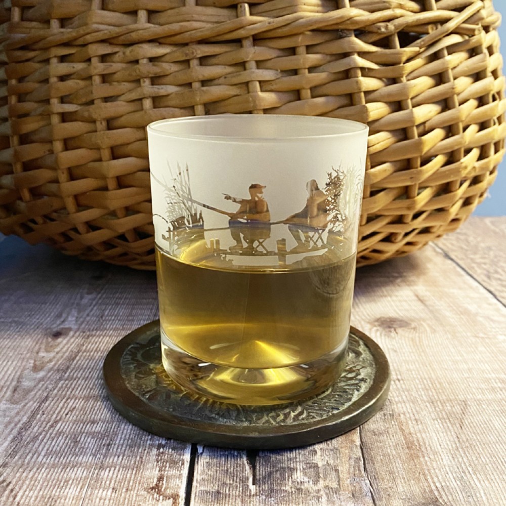 The high quality glass tumbler has a deep glass base with a cone indent, creating a weightly glass with a luxury feel. Ideal for juices or for whisky the glass is etched with a lovely, scenic design featuring multiple fishermen around the rim.